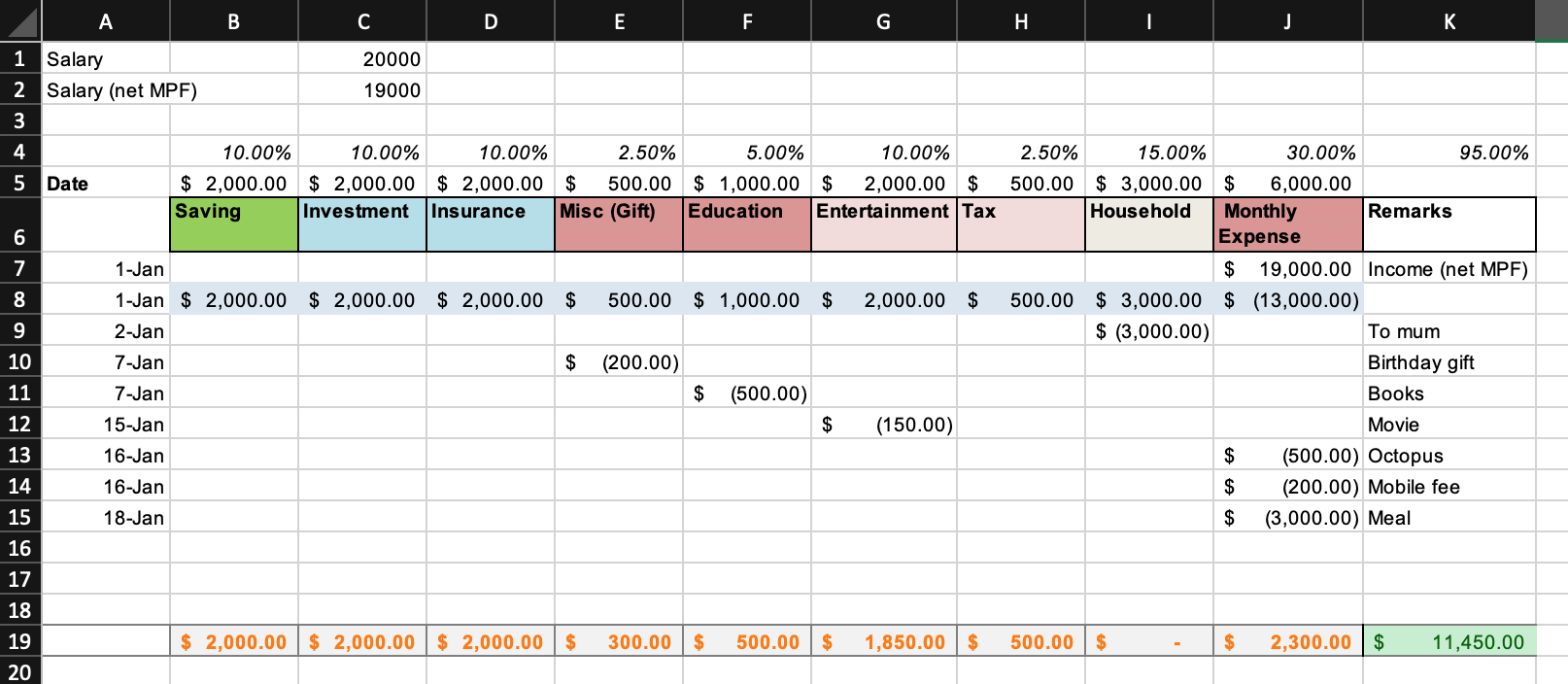首先係要知道自己嘅每一項強制支出同生活使費,咁對自己財政能力先有full picture架嘛。好似我(一個有強迫症嘅小師奶)就係因為懶得不停登入唔同網上銀行戶口,變態到會將唔同銀行嘅月結單同信用卡交易紀錄,全部入落一個Excel表,咁自不然所有支出使費一目了然。