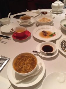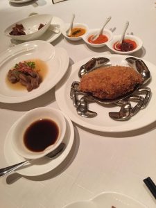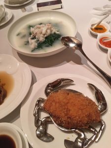 三個人食飯,望住個Menu,選擇太多好難抉擇。唯有再爬文,睇吓人哋覺得有啲乜嘢好食。見大家推介,要咗個前菜酒浸鴨舌、黃金炸釀鮮蟹蓋(一份)、鮮蟹肉米湯浸菠菜苗、龍蝦湯脆米海鮮泡飯。