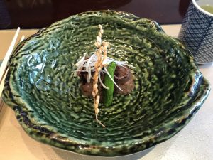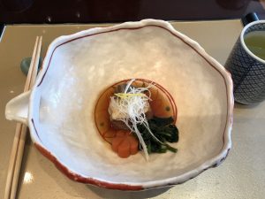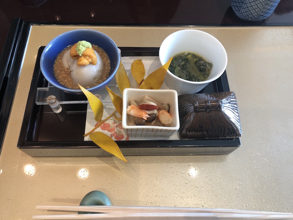 話咁快前菜就上咗,嘩,成間草屋,我仲以為係張牙籤嘅添。打開草屋,入面有日本菇、蝦、同埋一粒杞子。右上角有一對講唔出名嘅野菜,勾咗欠,幾好味。左上角有兩舊肥美嘅海膽,上邊配上新鮮磨嘅山葵,好鮮甜,下面有一舊謎團米糕,味道唔係好食得慣。中間係為咗提升飲食氣氛嘅(應該係)樹葉,有同事個餐上面係紅葉嚟㗎,仲附送紅色嘅果子,可惜同事唔肯試吓食唔食得⋯⋯