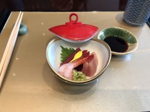第三道菜係刺身,有兩隻鮮甜嘅甜蝦、兩片深紅色嘅吞拿魚(赤身?)、兩片疑似油甘魚(呢個人識食唔識辨別魚嘅品種),仲有鮮磨嘅秋葵,真係憑秋葵嘅味道就可以知道日本餐廳嘅質素。
