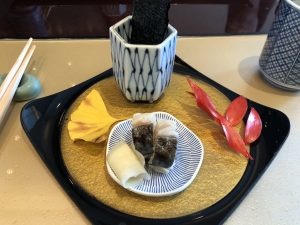 第四道菜係魚壽司,我個人覺得有啲失色,雖然佢終於俾咗紅葉我⋯⋯侍應姐姐會教,用筷子夾起魚肉連飯,用紫菜包住一齊食,壽司已經調咗味,唔需要額外加豉油。可能我都唔係好好有皮嘅魚刺身壽司,一般般。食完一舊,試吓食啖薑嚟沖淡下口腔嘅味道,點知辣到我往生,努力食埋剩低嗰舊,感覺都係一般般。