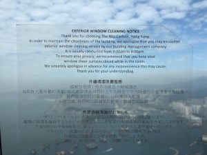 好可愛嘅陽台,玻璃窗上面仲會有清潔吊船嘅溫馨提示,有中文、英文、日文。