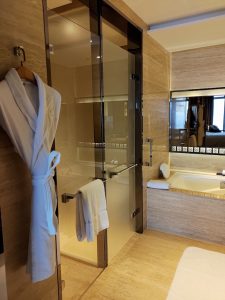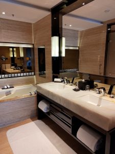廁所同企缸都係獨立空間,可能因為空間比較大,使用雙洗面盤設計,大家唔使爭位用。花灑係雨林式,亦唔會好似某啲酒店有雨林式得黎都要就位先林得晒成個身。同埋洗手盆嘅水龍頭可以同沖涼房同時開,水溫冇差別。