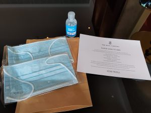 疫情時期,酒店送兩set口罩、同埋消毒搓手液。
