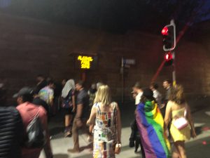 不是很敢明目張膽地拍照,但是模糊的都可以看見Parade This Way!!! 是Parade耶!然後隨着人群走,旁邊都是精心打扮的彩虹色,而我倆是行山裝束,還一身黏糊糊的⋯⋯