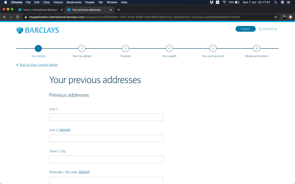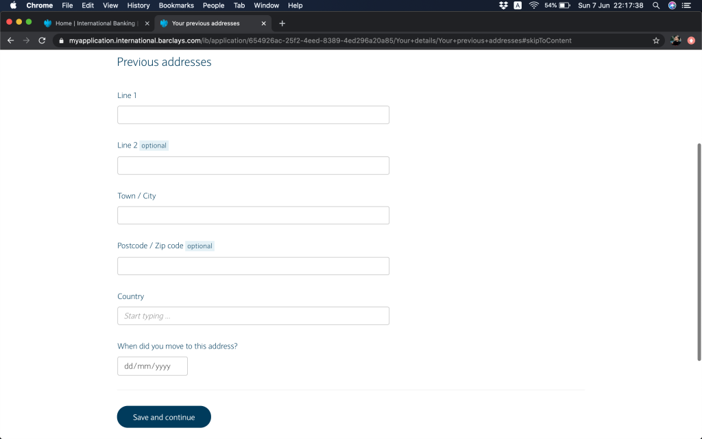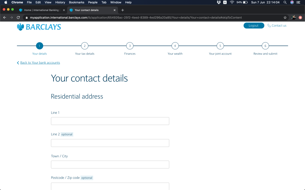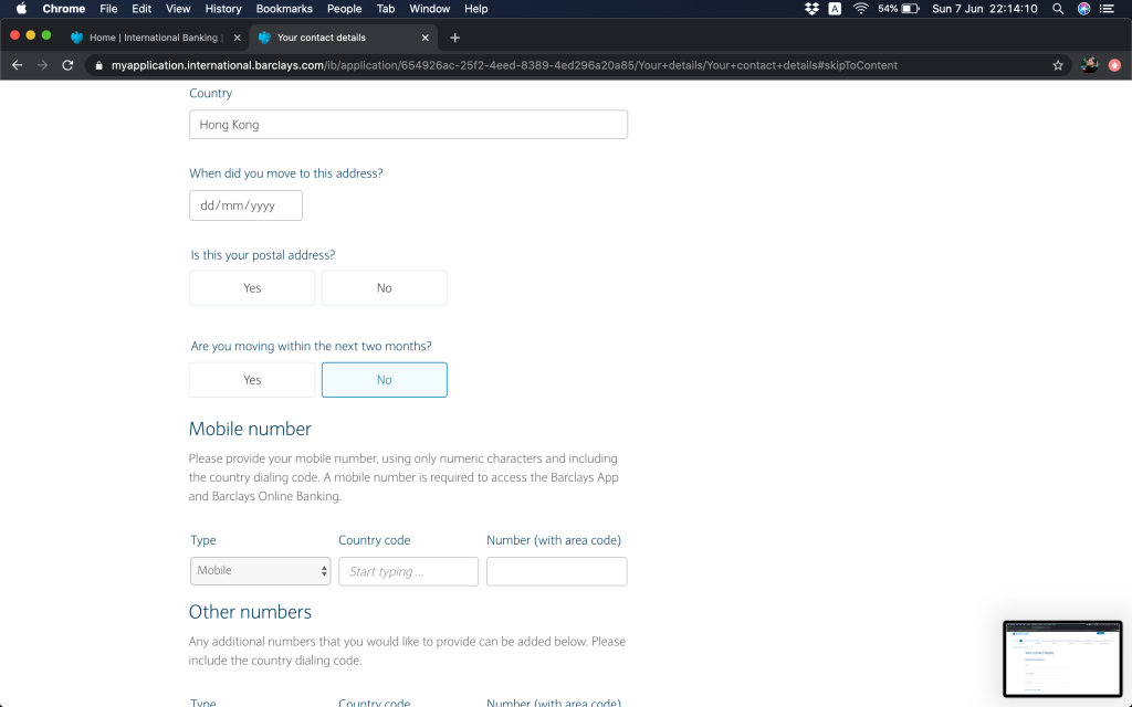 然後要填居住地址(呢度個Postcode / Zip code嘅field做得幾好,係optional,唔似有啲外國網頁焗你填,需要時候我會打00000)。特別少少佢需要你填上你幾時搬入去呢個地址,住得耐嘅鬼記得咩,我都係約莫寫一個年份配上1月1號咁上下。會問埋呢個係咪你嘅收信地址,嚟緊兩個月你會唔會有計劃要搬。
