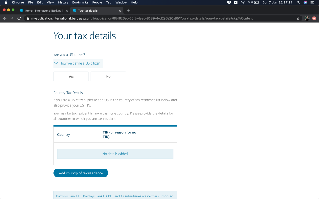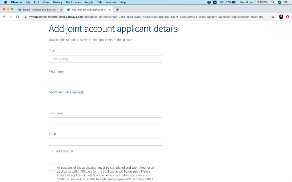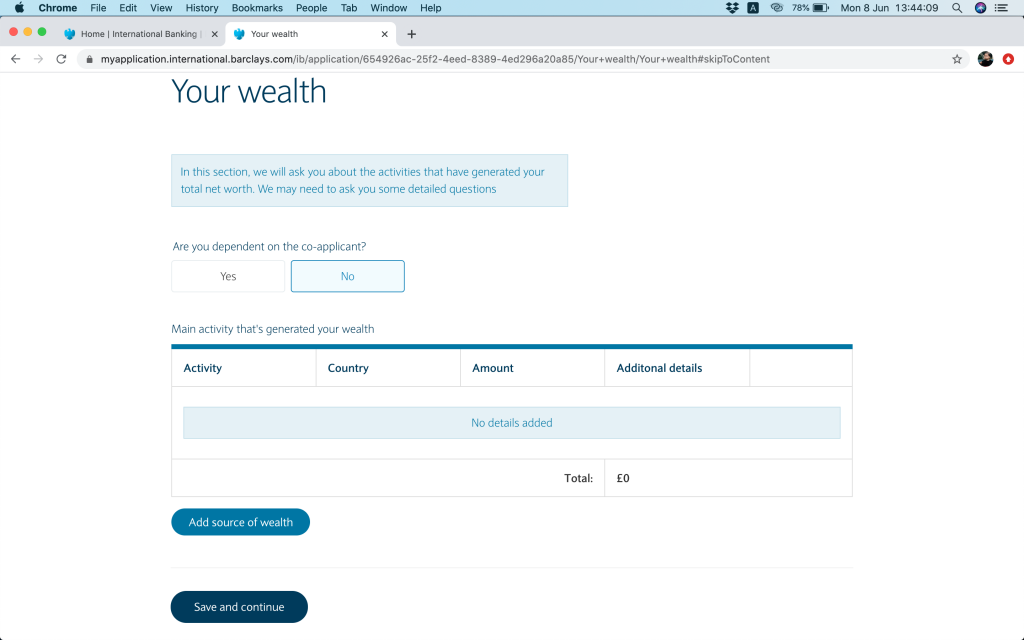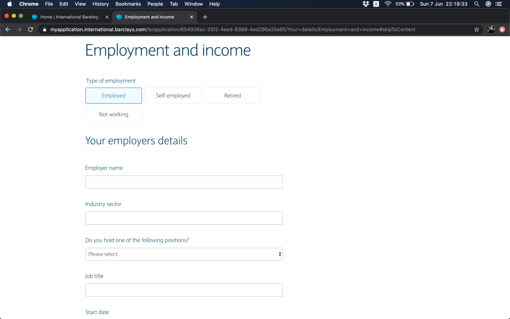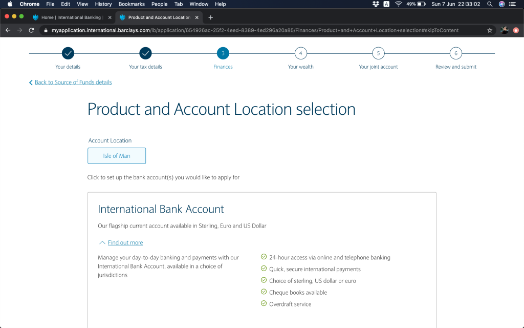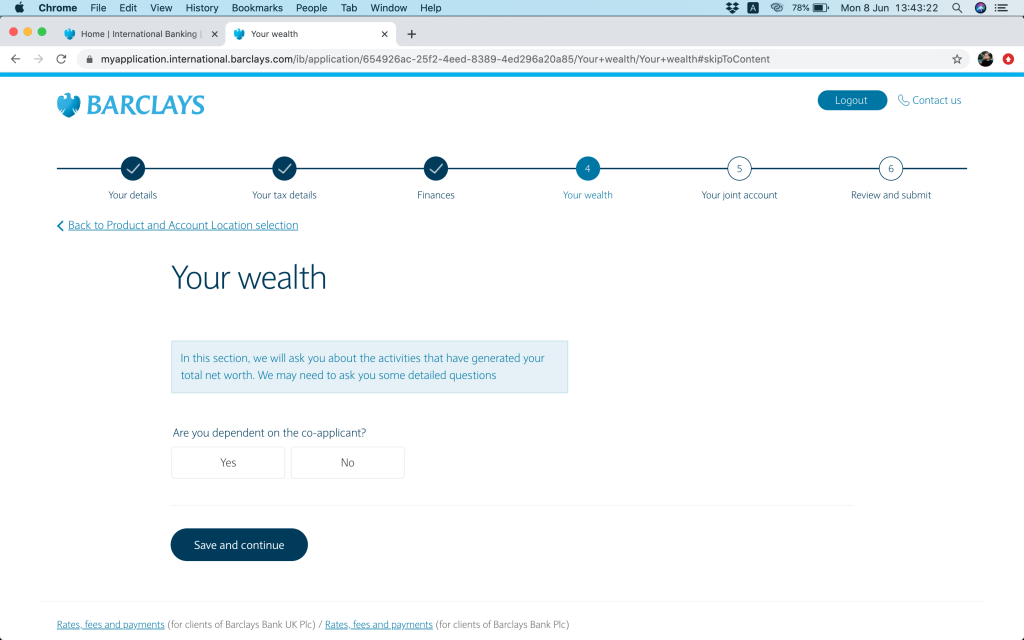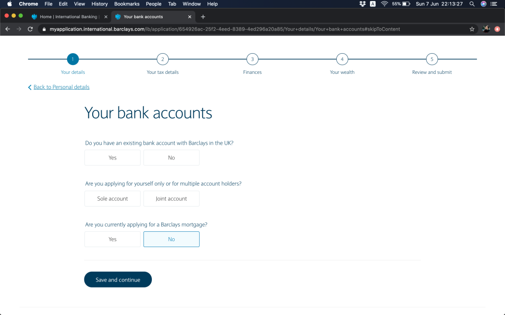 跟住就問返銀行帳戶資料,(1)本身有冇持有英國Barclays銀行帳戶,(2)今次係自己申請定係多過一個帳戶持有人,(3)有冇申請緊Barclays按揭(上邊咪問過囉,你答咗,呢度就會幫你自動選擇)。