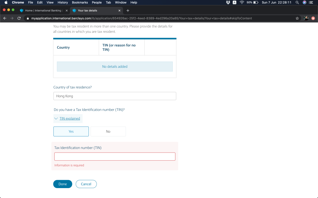 稅務資料,提交聲明你係唔係美國稅務居民。如果唔係,咁你係邊個國家嘅稅務居民(呢個系統算係唔錯,佢有個TIN解釋,主要就係如果依家身處地方稅務居民係冇TIN嘅,應該點填),香港來講,TIN會係你身分證號碼,冇括弧。