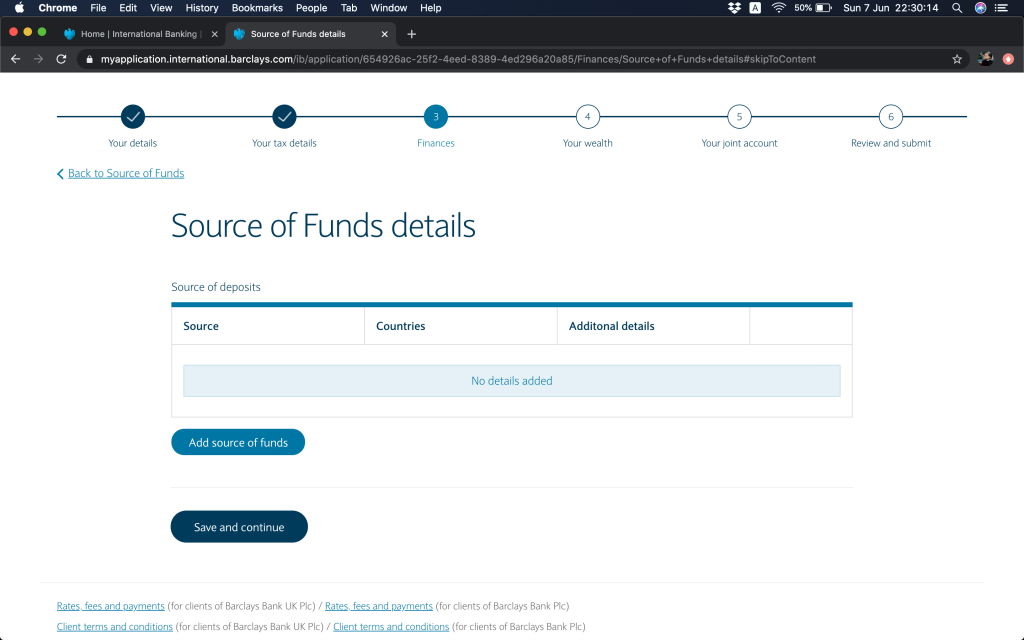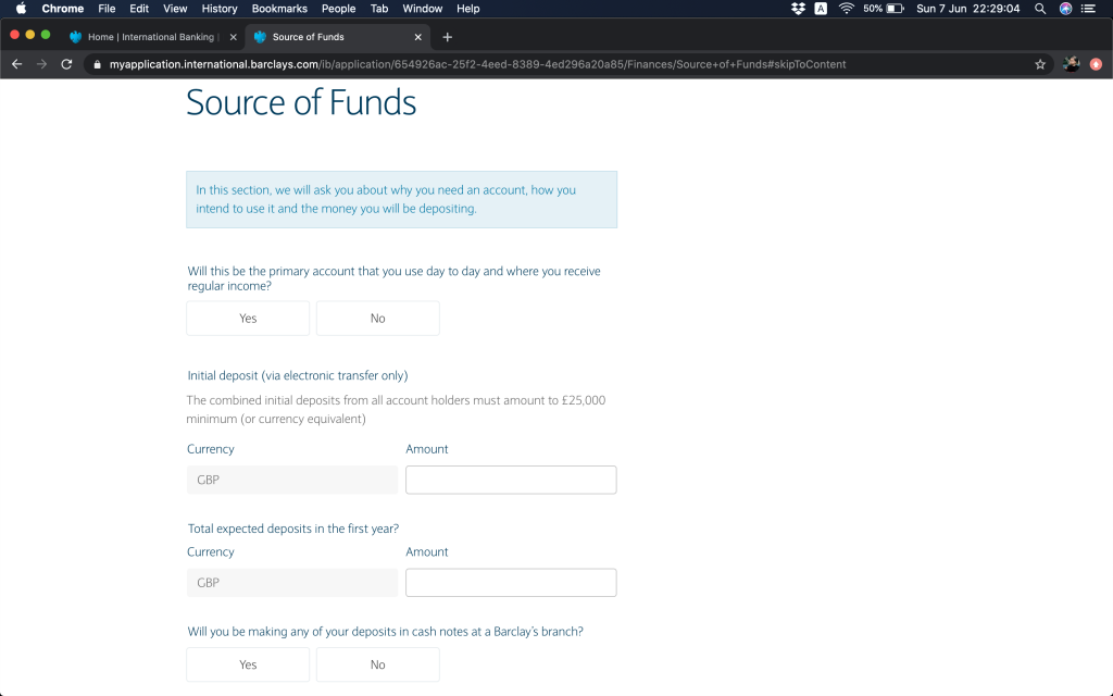 黎到資金來源,會問你點解需要呢一個戶口,你放入嚟啲資金諗住點用。呢個會唔會係你主要嘅銀行帳戶用作收取穩定收入、初期存入資金數目(上面講過,最少GBP25,000或其他等值貨幣)、開戶後第一年預期存入資金數目、你會唔會將你嘅存款響任何一間分行以cash notes形式提取。