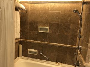 沖涼冇玻璃企缸,要企響浴缸入邊沖涼。第一次見雙層浴簾!以前用浴簾都會將佢拉入個浴缸入邊,費事沖涼嘅水流咗出去洗面盤地板。今次用雙層浴簾,防水個面拉入浴缸,再加一面就放浴缸出邊,雙倍擋水!好溫柔。