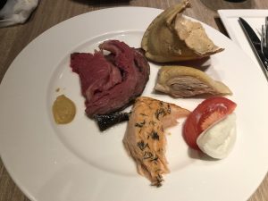 都係行返去熱食嘅地方安全啲,相對冇咁多誘惑。仲記得上次響Mandarin Oriental (MO) Clipper Lounge,食過牛腩一般嘅牛扒。今日嚟試吓JW Cafe嘅大嚿牛扒肉,再拎埋少少芥末,如果舊肉好味就應該唔使用到。隔離啱啱開咗一盤迷迭香三文魚,麻煩比一小塊我呀唔該。