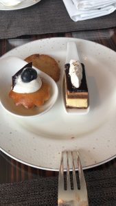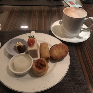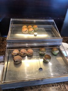 見到下午茶餐,有三款唔同嘅迷你漢堡,好似有蕃茄芝士、煙三文魚、同埋有brie cheese(係一隻好軟滑嘅芝士)。可惜我三種都唔食得⋯⋯好可惜。