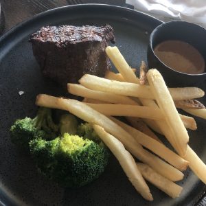 左邊係豬腩肉,食落有燒肉嘅感覺,但豬肉有啲韌,唔係我杯茶。右邊嘅係牛柳,超超超超好食,肉味濃,唔算肥,不枉我哋加咗60幾蚊去食呢塊牛柳。長薯條以為會唔好食,但食到最後仍然鬆脆,中間心唔會粉,抵讚。