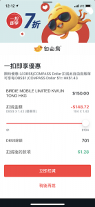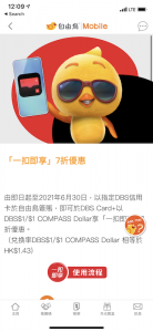 然後響自由鳥嘅Apps入面,可以見到DBS信用卡嘅推廣(請詳見信用卡大全):「一扣即享」七折優惠。