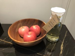 生果盤係三隻蘋果,仲有一杯菊花茶,用玻璃杯同牛油紙封住好搞笑。