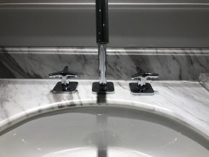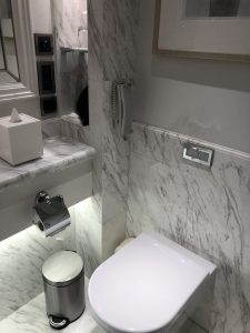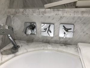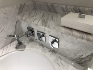 同Cordis唔同,嗰邊係枱上洗面盤,仲要係透明玻璃好容易睇到有花痕。呢邊設計一樣,但係佢喺台下盤。如果就咁睇落去啲雲石紋比較花,但佢可能好多洗手盆下面嘅暗燈,打得好光,所以就冇咁覺眼。