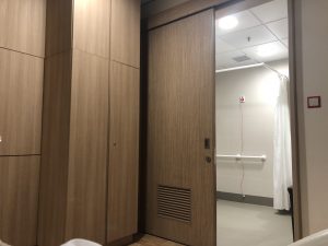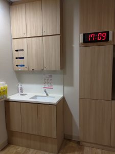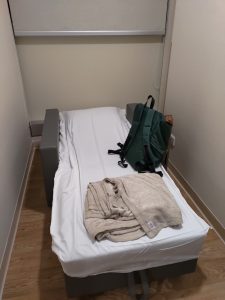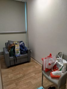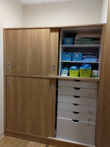 大門口右邊有儲物櫃,應該係要黎接生嘅物資。左邊都係儲物櫃,𥄫到有個Welcome Pack,入面有沖洗瓶、漱口杯、牙刷等等,等陣問吓姑娘點解唔比我先。