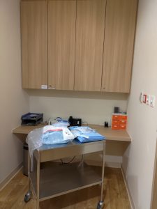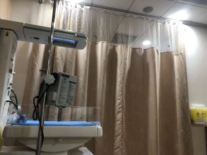 然後就有道簾,拉開之後右手邊就會見到初生嬰兒瞓(應該係檢查用嘅)嘅床仔。 因為大家都以為我就快生,一開始呢張床仔係有着燈嘅,隨着我宮頸一直未開,就熄咗燈,然後孤零零咁放響度。