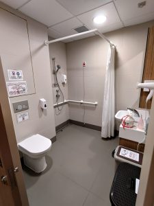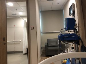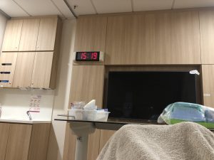 然後就係我張變形金剛床(見生產當日記錄),可以望住一部大電視, 懶人伸手就可以將張枱仔移埋心口,左手邊可以見到有個洗手空間,每次助產士同何醫生入嚟攻擊我下面之前,就要喺度洗手。