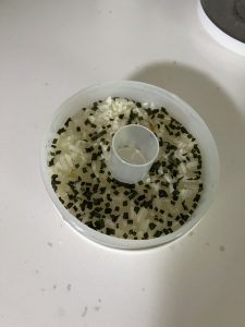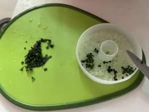 D222: 發現佢唔係好鍾意食菜,所以切碎啲菜撈落啲飯到。