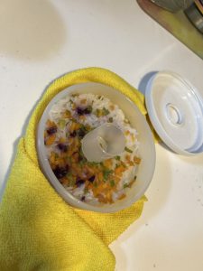 D227: 今日勁呀,再試蛋黃,晏晝食原塊紫椰菜、紅蘿蔔、紫椰菜飯(係紫色㗎)、比目魚。夜晚食雞肉、迷你菇(抓住啱啱好,係咁損啲汁)、娃娃菜、橙、布冧。