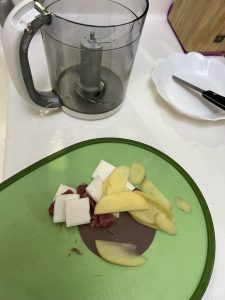 D188: 用豆漿機blend蘋果蓉比QQ試,食到佢扁嘴。有多嘅就放落去食物格。用錯左blended soup嘅function,搞到蘋果蓉熟左。後來先知應該就咁用smoothie function就算。