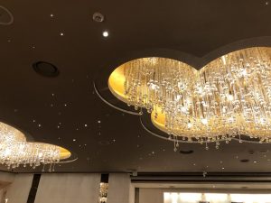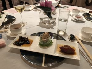 star hall另外一個selling point,就係march in嘅時候,全場熄燈,天上面嘅燈飾同埋天花板會有星星閃耀嘅效果。明明係一個咁多人嘅旅行團,佢一早都知道收咗幾多客,但係我哋初初坐低嘅時候天花版嘅星星都仲未着燈,差唔多等到第三四個餸上場嘅時候先至着燈。