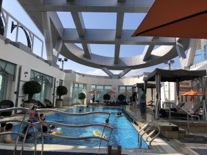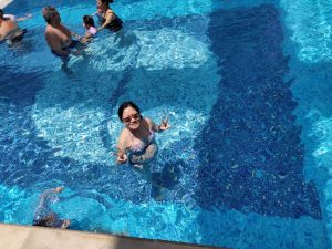 響泳池旁邊嘅熱水池浸下腳,真係超熱。紀念一下同個肚一齊落水。Hello QQ。