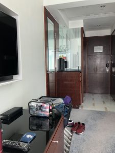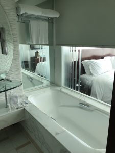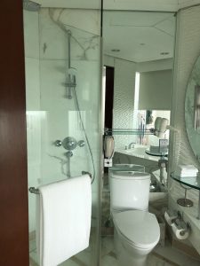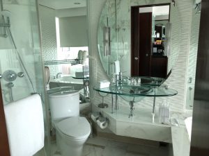 浴室廁所就間間都差唔多。Cordis特別在個洗手盆係透明玻璃,可以見到枱底嘅物品,可能設計師想有多啲空間感。但我就覺得個玻璃面盆成日有水珠,要特登spare一條毛巾出嚟抹水。強迫症發作。但點都強過美麗華個洗手盆。