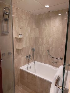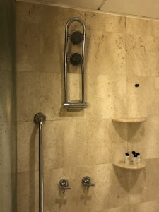 沖涼房好得,洗手盆開水唔會影響沖涼房水溫,合格。兩個花灑頭好過癮,水溫穩定,好玩過雨林。雖然沖涼房係一棟好單薄嘅玻璃門,但係啲水唔會湧出嚟,唔似得美麗華咁。
