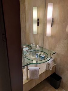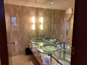 雙洗手盆,但係位置好奇怪,玻璃盤凸咗出嚟成日好似頂住個肚咁,應該係枱面位置想慳位,但係又唔想洗手盆過細。