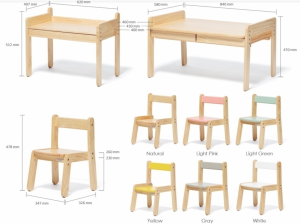 枱櫈係分開買,枱(~$1490 large; ~$990 small)櫈(~$690)。原木幼兒家具系列,用松木。同buono唔同,張凳無防後翻設計。