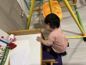 唔知點解呢個小朋友好努力將顏色筆篤落去張枱執鞭個窿度,佢自己發掘到呢一個遊戲出嚟,我唯有當係鍛鍊緊小手肌肉。