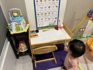 小朋友夠120 cm身高之後就要轉書枱。好欣賞日本嘅木櫃桶,好似入榫咁樣嘅設計。呢個系列正正方方,仲可以揀書枱、書架、櫃桶,唔同組合。櫃桶都係似Office嘅小露寶,可以有碌推來推去。