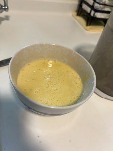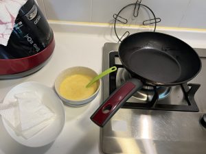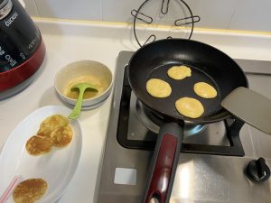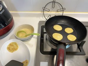攪拌好蕉蛋漿,就可以開鑊煎,唔知係咪個鑊洗得唔乾淨,QQ先敏感呢。