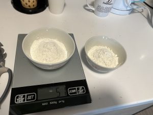 高筋麵粉50g+低筋麵粉50g,撈埋變成中筋麵粉100g
