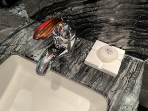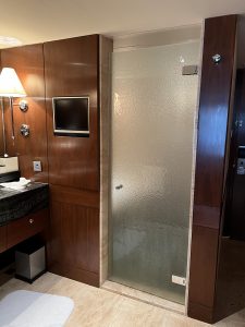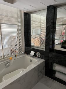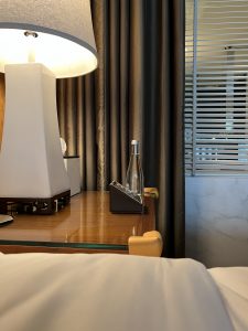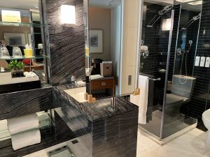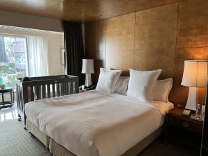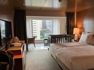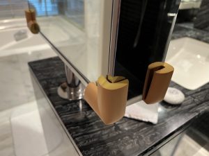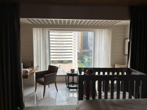 床頭望浴室景,枱角仍然有防撞角。每個櫃把手都有防撞膠,連電制都有保護膠。非常細心,係最貼心嘅酒店。