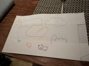 今次晚餐就牛扒炭香味太重,仲有兒童蠟筆同畫紙,但QQ都唔受控制咁喊,要keep住氹。