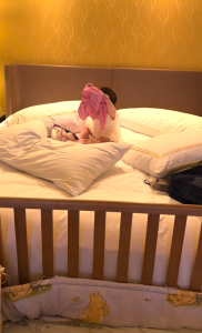 同場加映,小囡與海。枕頭陣,令佢唔好跌落床。
