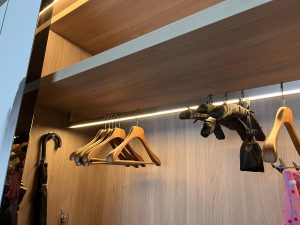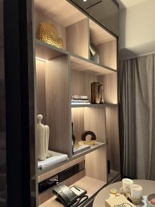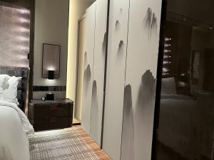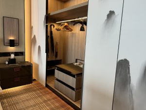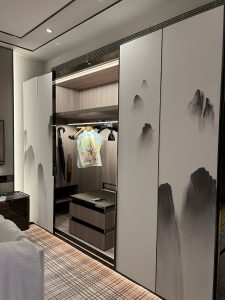 床後邊係山水畫衣櫃。第一次見衣櫃燈係響衣架通出光,subtle。
