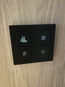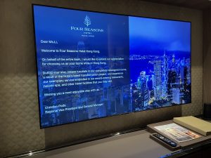 手動撳掣開窗簾先,但長老房間識得自動開。歡迎畫面係動態嘅,QQ見到好興奮。電視好大,但由於唔想比QQ睇電視,除咗歡迎畫面之外,其餘時間都無開…小寶表示可惜。