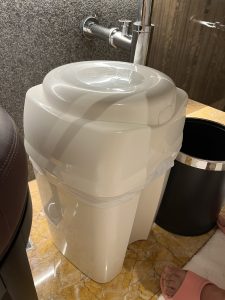 右邊係馬桶,馬桶係螺旋式沖廁,唔會彈水上黎。