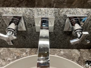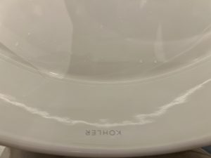 Kohler牆上水喉頭。孖洗面盆,無劃痕,應該係新裝修。水喉衝力太勁,洗面盆底太平,會彈水,呢樣有啲低b。