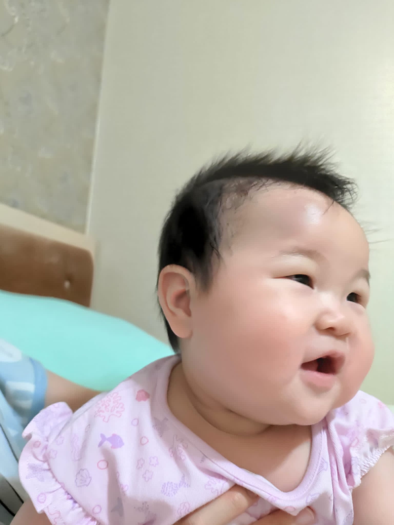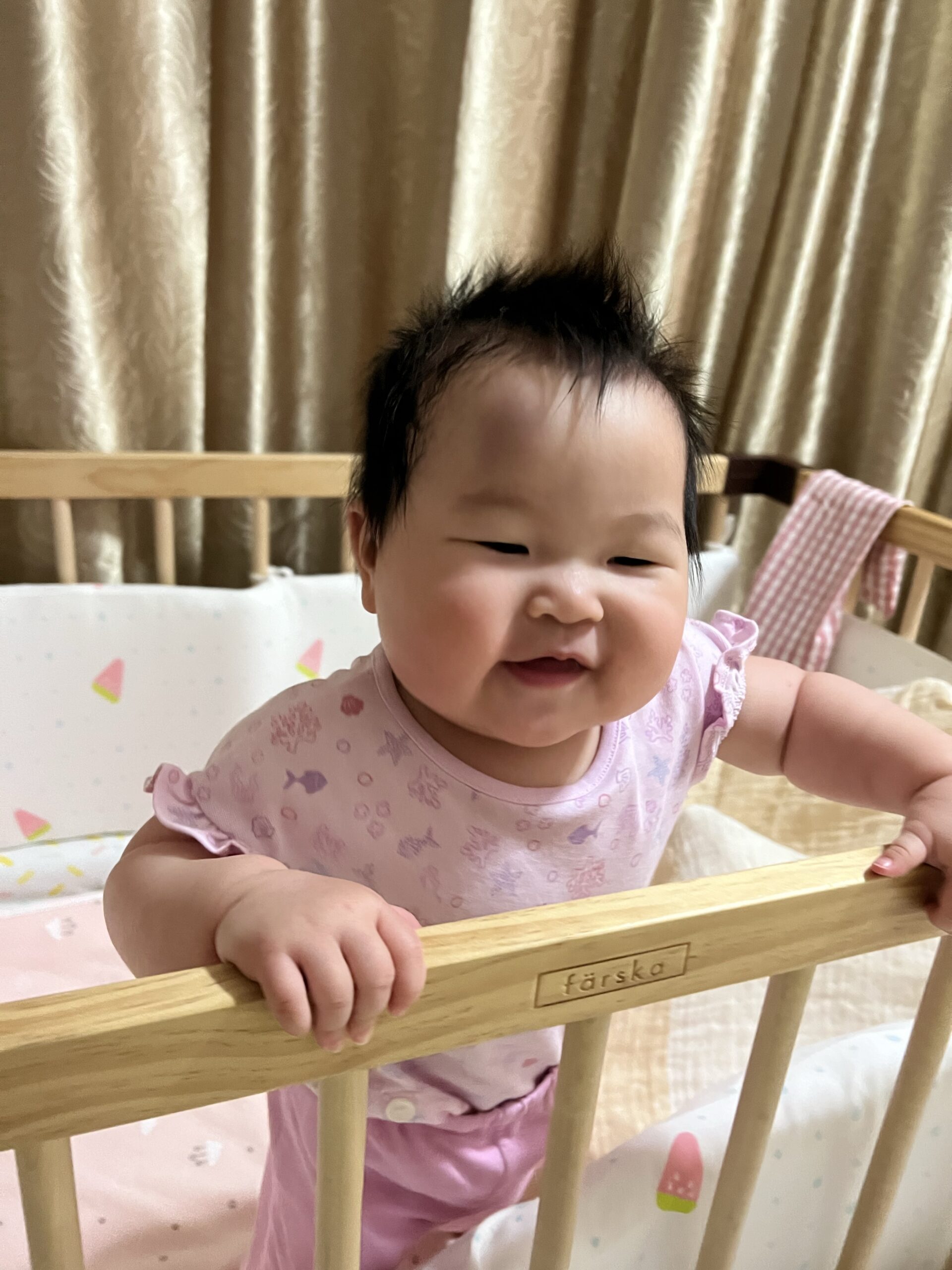 即時請假,埋身餵奶,我仲要言語上安撫小寶「嚇親爸爸啦,爸爸都好驚」,明明我都好驚佢跌到智商減10。抱落bb床,QQ又醒番,企番起身,識笑,識指人。book左13:50見醫生。