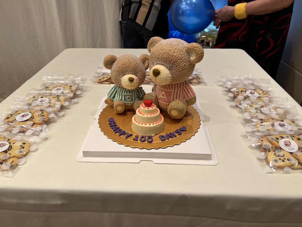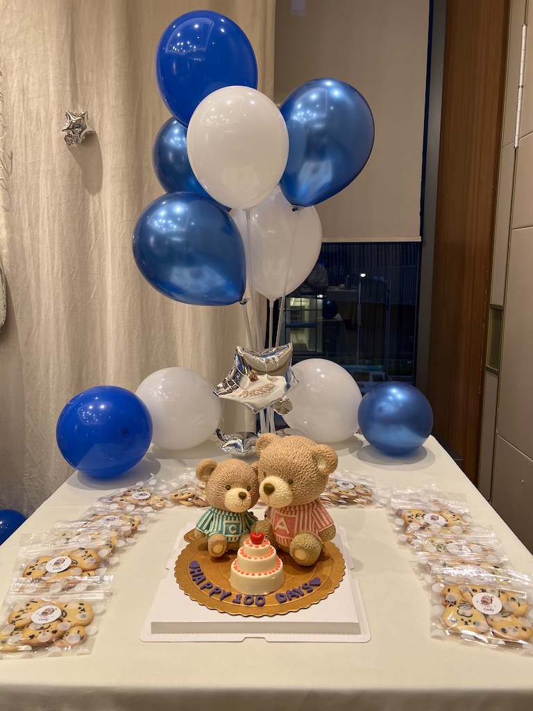 去到切餅嘅時候,細佬已經要依偎住家姐,所以我哋要用埋個茶杯嚟頂住。
